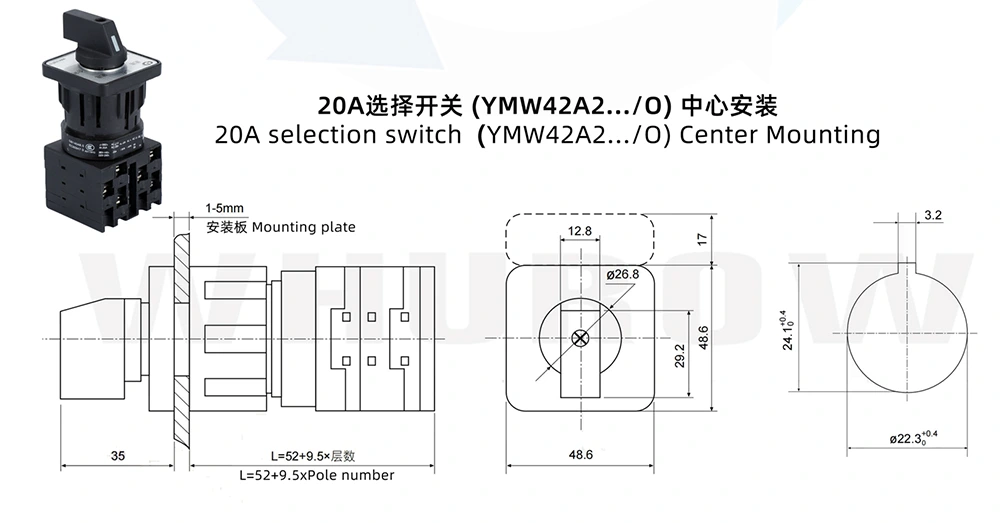 - Posição flexível e configuração de camada: 20A furo central montado alonga múltiplas posições Cam Switch suporta até 12 posições de operação e 1 a 12 camadas de switch, que podem ser personalizadas de acordo com as necessidades reais do equipamento para atender a cenários de controle complexos.