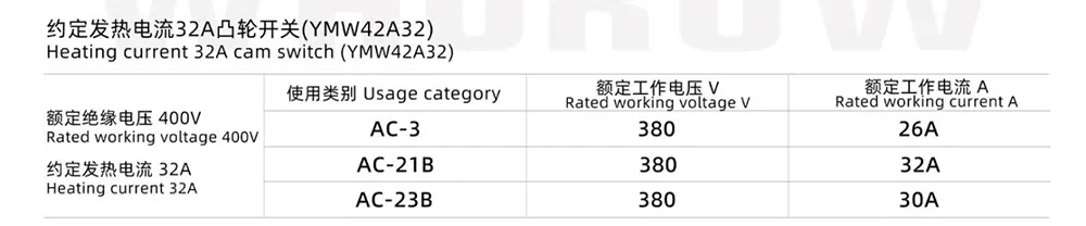 - Chave Cam 32A: Adota os mesmos ângulos de posicionamento de 30°, 45°, 60°, 90° do modelo 20A, com no máximo 12 posições de operação e 1–12 camadas de chave. Possui capacidade de suporte de corrente mais forte, adequada para ocasiões com maiores requisitos de energia.